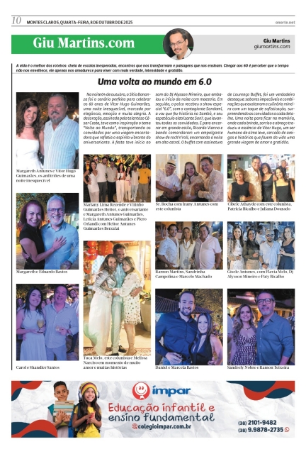 “A vida é o melhor dos roteiros: cheia de escalas inesperadas, encontros que nos transformam e paisagens que nos ensinam. Chegar aos 60 é perceber que o tempo não nos envelhece, ele apenas nos amadurece para viver com mais verdade, intensidade e gratidão.”