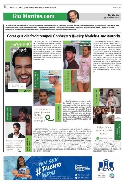 A Quality Models é a agência de modelos pioneira de montes claros, com 30 anos de experiência no cenário nacional e internacional, a agencia é instalada na rua Doutor Veloso n 608 - Segundo Piso, centro. A Quality Models foi fundada em 1995, logo após seu diretor, Giu Martins, deixar o cargo de Coordenador de Produção da extinta TV Montes Claros (hoje INTER TV GRANDE MINAS).