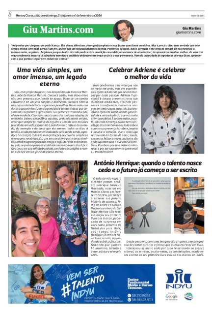 Hoje, com profundo pesar, nos despedimos de Cleonice Martins, mãe de Ramon Martins. Cleonice partiu, mas deixa entre nós uma presença que jamais se apaga. Dona de um sorriso cativante e de um jeito simples e acolhedor, Cleonice tinha a rara capacidade de tocar as pessoas pelo olhar. Havia nela uma doçura quase infantil, uma ingenuidade bonita, dessas que desarmam, confortam e aproximam. Sua presença transmitia paz, afeto e verdade. Cleonice cumpriu uma das maiores missões de uma mãe. Deixou cinco filhos adultos, profundamente unidos, amor que sempre foi motivo de orgulho e uma de suas maiores felicidades em vida. Essa união é, sem dúvida, o reflexo do cuidado, do exemplo e do amor que ela semeou todos os dias. A família, ainda profundamente abalada pela dor da perda, agradece de coração todas as manifestações de carinho, orações e mensagens recebidas. Eu, que me considero parte dessa família, também agradeço a cada amigo e seguidor pelo acolhimento, pelo respeito e pela sensibilidade neste momento tão difícil. Que Deus, em sua infinita bondade, conforte os corações e receba Cleonice em luz, paz e descanso eterno.