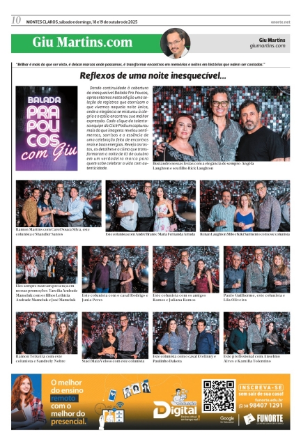 A partir da próxima semana, o público vai reviver os momentos mais marcantes da inesquecível “Balada Pra Poucos”, realizada na noite 03 de outubro, no Bull Club. Um evento que reuniu grandes nomes da sociedade montes-clarense, música envolvente, produção impecável e uma energia que traduziu o verdadeiro espírito das festas assinadas por Giu Martins. Os flashes oficiais, registrados pela equipe da Click Podium, irão ao ar com exclusividade em nossa próxima coluna, revelando os melhores ângulos, os sorrisos mais espontâneos e o brilho que tomou conta da pista durante toda a noite. Prepare-se para relembrar, ou descobrir, por que a “Balada Pra Poucos” entrou para a lista das festas mais comentadas do ano. Fique ligado: na próxima edição da coluna, os holofotes se voltam para quem fez parte dessa noite inesquecível!
